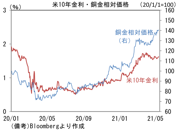 - 為替(G10通貨)はUSDが軟調も全般的に小動き。USD/JPYは108半ばへと下落、EUR/USDは1.21半ばへと上伸。コモディティはWTI原油が65.3㌦(+0.4㌦)へと上昇し、銅は10460.0㌦(+78.0㌦)へと上昇。金は1836.1㌦(▲1.5㌦)へと低下。銅金相対価格(銅÷金)は一段と水準を切り上げている。ビットコインは下落。