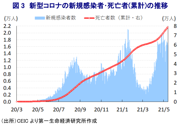 - 同国はワクチン接種が比較的進む一方、政府が先月に公表した財政健全化や低所得者層支援の財源確保を目指した「増税策」を巡り反政府デモが激化している。政府は撤回を余儀なくされ、反政府デモとの対話を目指すが、安易な妥協は格下げリスクを高めるなど難しい対応が迫られる。感染「第3波」真っ只中のデモ激化で感染状況が悪化する可能性もある上、来年の大統領選では左派への巻き戻しの可能性も高まろう。