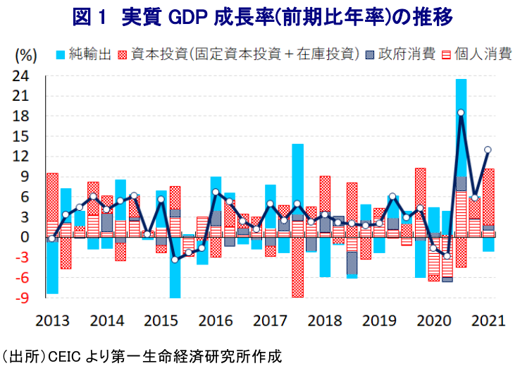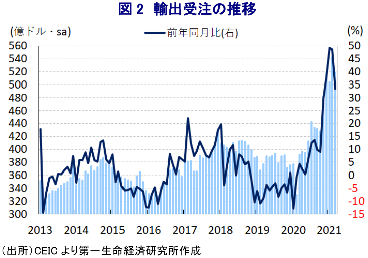 - 一昨年末に中国本土で確認された新型コロナウイルスは、中国本土と経済面で関係が深い台湾での感染拡大が懸念されたが、当局による早期且つ徹底した対策により封じ込めが図られてきた。感染対策の「優等生」となるなか、経済面でも完全にその影響を克服しており、年明け以降は世界経済の回復や半導体不足も追い風に外需を中心に底入れが進むなど、足下の景気は回復局面から拡大局面に一段と飛躍している。