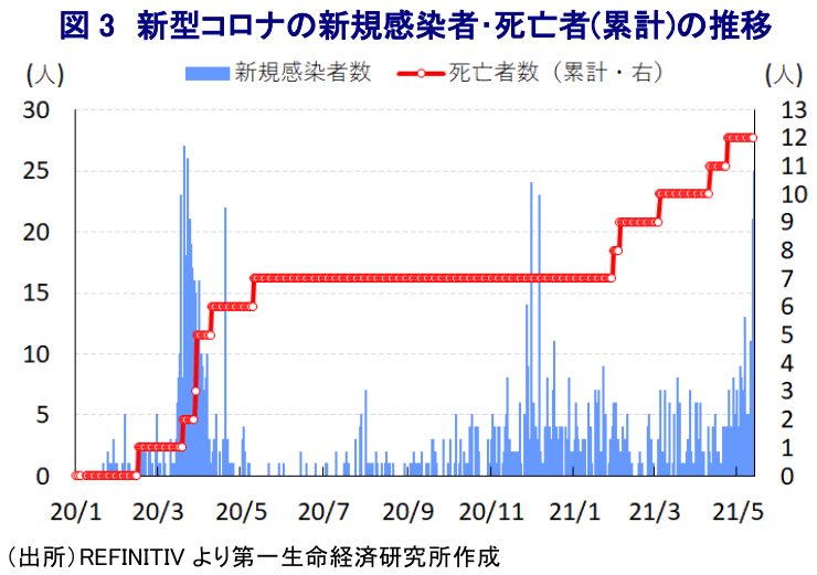 - 感染対策の面は「優等生」である一方、中国本土との関係も影響してワクチン確保に手間取り、足下のワクチン接種率は0.54%と大きく後れを取っている。来訪者を中心に感染が確認されたが、先月末以降は市中感染が確認されるなど再拡大リスクが高まっており、部分的に行動制限が再強化されている。台湾の行方は半導体を通じて世界経済に影響を与える上、その対応の成否はわが国も「教訓」とする必要が高いと言えよう。