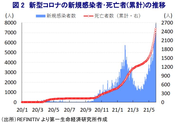 - 足下の世界経済は、主要国で新型コロナウイルスの感染収束やワクチン接種による景気底入れが進む一方、新興国で変異株による感染再拡大が広がるなど好悪両方の材料が混在する。マレーシア経済は輸出依存度が極めて高く、年明け以降は世界経済の回復が景気の押し上げに繋がる動きがみられた。他方、昨年末以降の感染再拡大を受けて非常事態宣言が発令され、一旦は感染収束の動きがみられたものの、先月以降は再び感染が拡大する「第3波」が顕在化するなど状況が悪化する兆しが出ている。