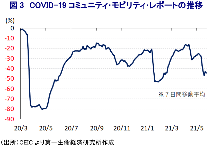 - 足下の感染再拡大は変異株の流入に加え、長期に亘る規制疲れやラマダン明けの大祭による人の移動の活発化が影響した模様である。足下の新規感染者数は周辺国と比較して小規模だが、人口対比ではインドやアジア新興国と比較して突出しており、首都クアラルンプールなどでは医療ひっ迫懸念が高まっている。行動制限の再強化を受けて足下で人の移動は大きく鈍化しており、内需への悪影響は必至と見込まれる。