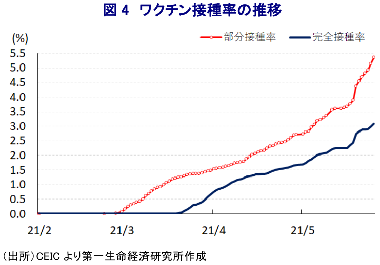 なお、同国経済は構造的に外需に対する依存度が極めて高く、欧米や中国をはじめとする主要国がけん引する形で世界経済の回復が見込まれるなか、先行きの同国景気は外需を中心に押し上げ圧力が掛かる展開が続くと見込まれ、当研究所は今月発表した最新の経済見通しにおいても今年の経済成長率は+6.1%と予想しており 6、中銀による見通し(+6.0~7.0%)の下限近傍の水準はクリア可能と見込まれる。他方、政府は景気への悪影響を懸念して行動制限の一段の強化には及び腰の姿勢をみせており、ワクチン接種を通じた早期の集団免疫の獲得を目指して、契約ベースでは政府の接種計画(向こう1年以内の国民の8割以上を対象とするワクチン接種完了)の必要量を上回る量を確保している。しかし、現実のワクチン調達スケジュールは計画から大きく遅れており、今月26日時点における完全接種率(必要な回数をすべて接種した人の割合)は3.09%、部分接種率(少なくとも1回は接種した人の割合)は5.35%と世界平均(それぞれ5.22%、10.21%)を大きく下回る水準に留まっている。その一方、中銀は景気下支えの観点から追加緩和に含みを持たせる姿勢をみせてきたものの、足下のインフレ率は生活必需品を中心とするインフレ圧力の高まりを反映して4年強ぶりの水準に大きく加速している上、足下では感染再拡大による景気減速懸念の高まりを受けて通貨リンギ相場に下押し圧力が掛かっていることも相俟って利下げ余地は急速に縮小している。マレーシア経済の行方を巡っては、これまで以上に新型コロナウイルスの感染動向やワクチン接種動向に注意する必要が高まっていると言えよう。