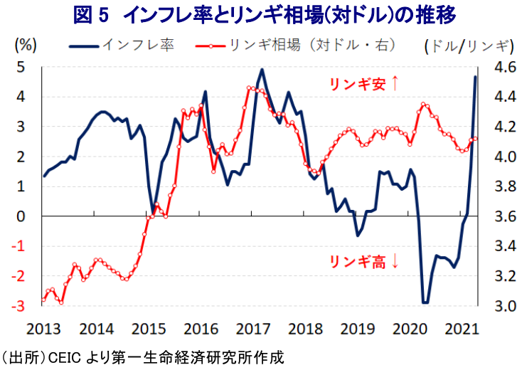 - 経済の輸出依存度の高さを勘案すれば、外需をけん引役にした景気回復が見込まれるため、現状で当研究所は今年の経済成長率を+6.1%と予想する。ただし、ワクチン接種が遅れるなか、足下ではインフレ昂進や通貨リンギ安の進展を受けて中銀の対応余地も狭まるなど厳しさは増している。同国経済の行方については、これまで以上に新感染動向やワクチン接種状況に注意する必要が高まっていると言えよう。