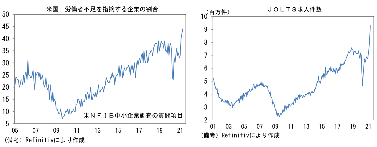 - 1つ目の視点は企業の人手不足感。①NFIB中小企業調査では労働者不足を指摘する企業の割合が空前の水準へと上昇し、②JOLTS求人統計では求人数が過去最高にある。一度解雇した従業員の呼び戻しに苦労していることが窺える。