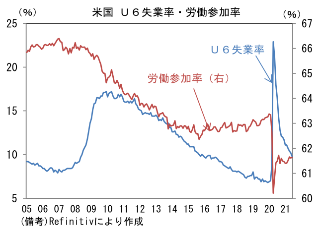 - 失業率は5.9%へと小幅上昇。労働参加率が61.64%へと0.03%pt上昇すると同時に、失業者数が+16.8万人となったことで見た目の失業率は上昇した。もっとも、フルタイムの職が見つからず止む無くパートタイム勤務に従事している人を失業者と見なした広義失業率(U6)は9.8%へと0.4%pt低下しており、労働市場の質的改善は進んでいると判断される。