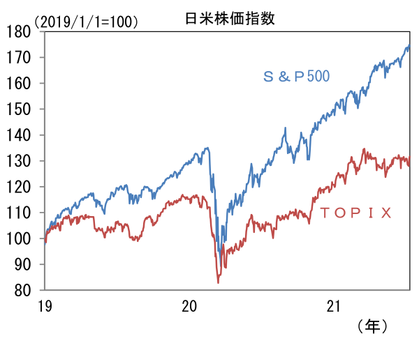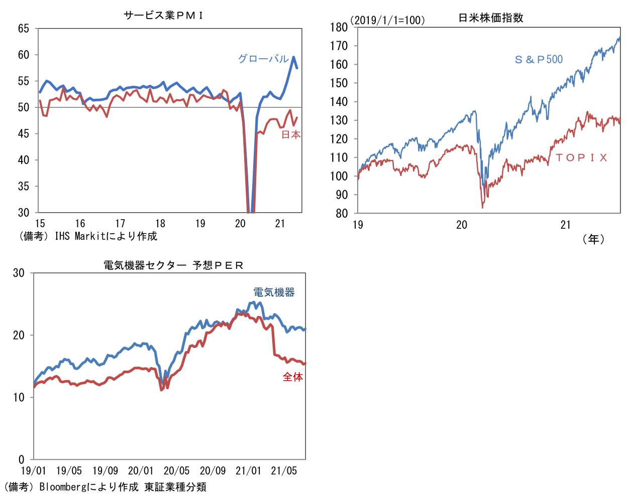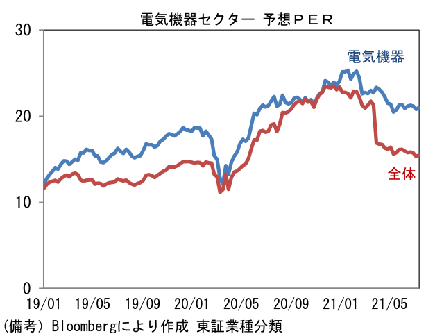 - この乖離は日本株の相対劣後を説明しているようにみえる。現在、日経平均が3万円を回復できずにいるのは、こうした内需の弱さが続くことを投資家が懸念しているからだろう。これまで日本株をけん引してきたのは半導体を中心とするIT関連財であった。もっとも、それらの銘柄が多く含まれる東証電気機器セクターの予想PERはパンデミック発生前よりも高く、既に業績拡大期待が織り込まれている状態にあると考えられることから、先行きに大きな期待はしにくい。今後、日経平均が3万円を回復するには内需関連の回復が極めて重要になってくる。個人消費を直接刺激する景気対策が肝となるが、それにはワクチン接種が進展し、コロナ感染状況が安定化するのを待たなければいけない。