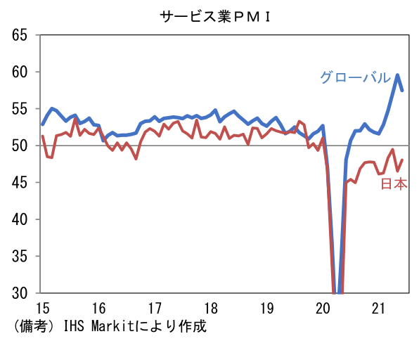 - 日本の内需は先進国対比でみると弱さが際立つ。各国の内需を色濃く反映するサービス業PMIは、グローバル(主として欧米)がパンデミック発生前の水準を大幅に上回っているのに対し、日本は50すら回復できずにいる。