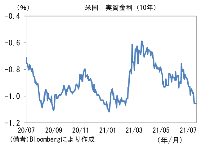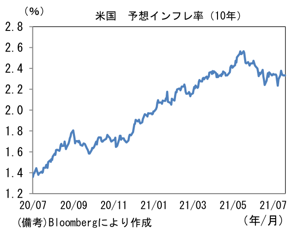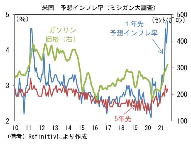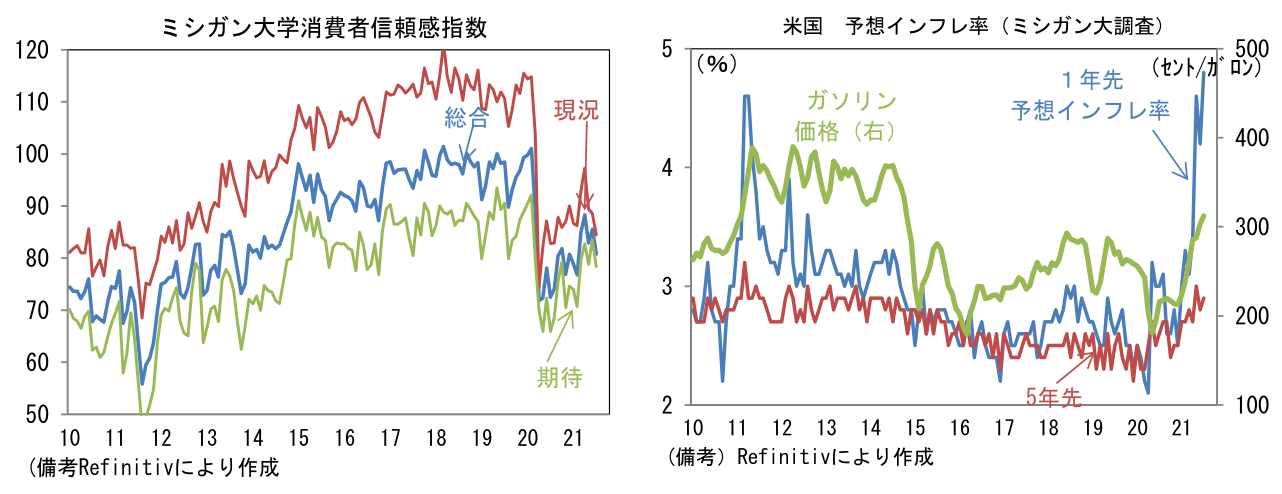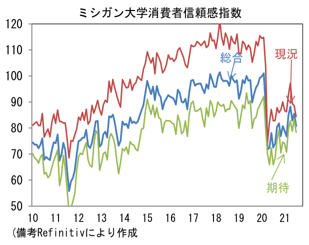 - 7月ミシガン大学消費者信頼感指数は80.8と市場予想を下回った。現況(88.6→84.5)が高水準を維持した一方、期待(83.5→78.4)へと低下。失業給付の特例措置が9月に全面終了するなど政策サポート減退が一因となった可能性。また予想インフレ率の上昇も一因の可能性がある。ガソリン価格上昇などから体感物価は上昇しており、予想インフレ率は1年先が+4.8%、5年先が+2.9%へと、それぞれ上昇基調が強まっている。