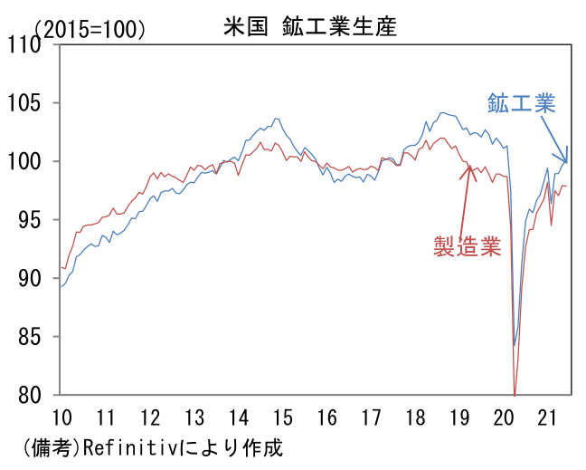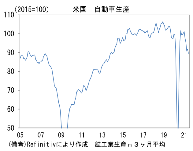 - 通常、ISMの60超は生産サイクルのピーク付近で観察される。そのため60到達は「天井」のサインと認識されているが、今次局面において重要なのは、実際の生産高(鉱工業生産ベース)がパンデミック発生前の水準を僅かに上回るに過ぎないこと。2021年6月の生産高は2018年4Qを▲3.8%も下回っており、なお相当な距離がある。製造業の設備稼働率をみてもパンデミック発生前の水準とさほど変わらず、生産能力は余力を残していると考えられる。これらから判断すると7月に生産サイクルがピークアウトしたとは考えにくく、むしろ今後は半導体不足の解消に伴い自動車を中心に増産モメンタムが再び強まることも考えられる。ISM製造業の60回復はさすがに期待しにくくとも、50後半は維持できるだろう。