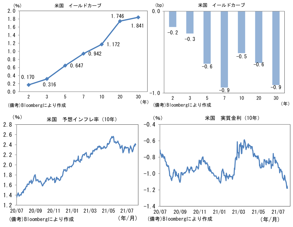 - 米金利カーブはブル・フラット化傾向。債券市場の予想インフレ率(10年BEI)は2.370%(+1.1bp)へと上昇。実質金利は▲1.201%(▲1.6bp)へと低下。