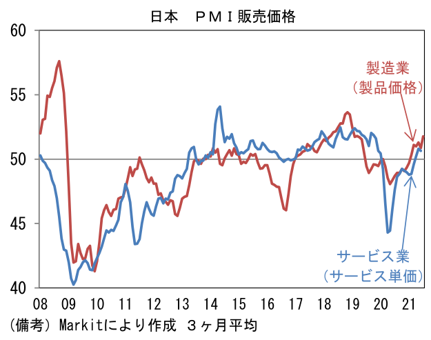 - 先行き注視したいのは、企業の価格設定スタンス。現在のところ需要不足に直面した企業は、値下げによって需要を掘り起こす戦略に距離を置いているように見える。通常の景気後退局面とは異なり、コロナ禍における需要不足はパンデミックによる活動制限に起因しているため、果敢な値下げを実施したところで客足が急回復しないことは自明であるから、そうした下で企業は採算確保を優先しているとみられる。実際、日銀短観で非製造業の価格設定スタンス(販売価格判断DI)を確認すると大企業、中小企業ともにパンデミック発生前の水準に戻りつつある。またPMIをみても製造業、サービス業ともに50を超えている。こうした事情もあり、極めて異例な需給ギャップが生じているにもかかわらず、CPIはさほど下がっていない。