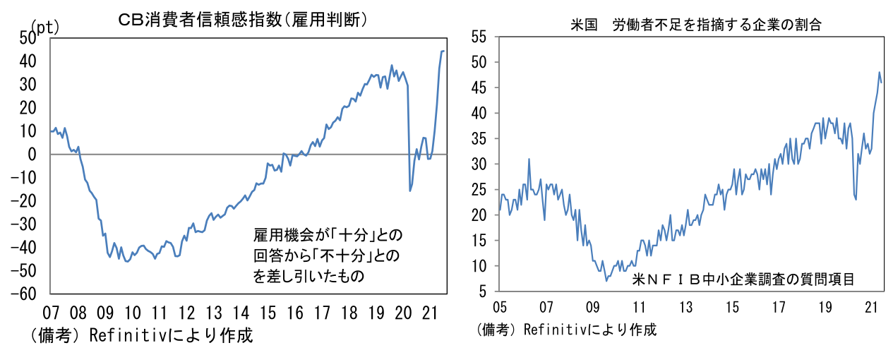 - 雇用関連指標に目を向けると、潜在的な就職機会が豊富に存在することが示唆されている。CB消費者信頼感指数の雇用判断DIは44.4へと上昇し、パンデミック発生前の水準を凌駕。就職活動が容易であることを示した。それに対応するようにNFIB中小企業調査では「労働者不足を指摘する企業の割合」が空前の水準へ上昇し、同時に雇用計画も上向いている。またJOLT求人統計では求人数が著しく増加するなど、あらゆる指標で企業の人手不足感が顕著になっている。そうした下で「雇用」の状況を問うサーベイ指標(ISM、PMI)は製造業・非製造業の双方とも改善傾向にある。振れの大きい雇用統計が弱かったとしても、これらソフトデータが軒並み強さを示していることに鑑みると、次月以降の雇用統計は回復する公算が大きい。経済の正常化ペースに失望する投資家は限定的だろう。8月4日のクラリダ副議長の発言前までは、2年金利がタカ派色の強かった6月FOMC以前の水準に迫る勢いで低下するなど、やや行き過ぎた緩和長期化観測が生じていたこともあり、7月雇用統計は金利上昇イベントになる可能性がある。