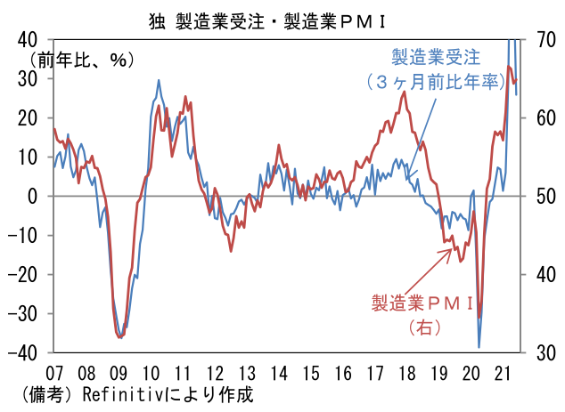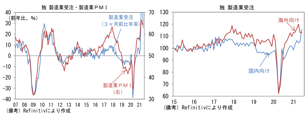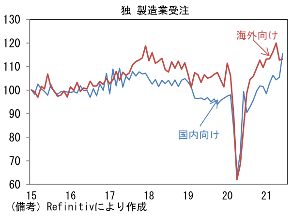 - 6月独製造業受注は前月比+4.1%と2ヶ月ぶりに増加。海外向けが+0.4%と微増に留まった反面、国内向けは+9.6%と強く伸びた。製造業PMIの強さと概ね整合的な結果。