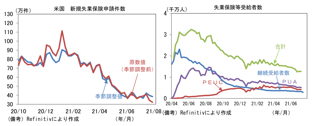 - 米新規失業保険申請件数は38.5万件と市場予想に概ね一致して前週比減少。原数値は32.3万件へと減少し、パンデミック発生後の最低を更新。継続受給者数は293.0万人へと前週比36.6万人減少。失業保険の特例措置打ち切り(9月6日、一部の州は打ち切り済み)を見据えて復職を遂げた人が相当数存在した可能性がある。また、本来は失業保険給付の対象とならないフリーランスや自営業者を対象にした措置であるPUA、失業保険が期限切れになった人を対象に給付を延長するPEUCは、それぞれ緩やかながら減少傾向にある。