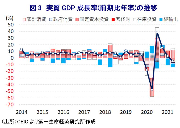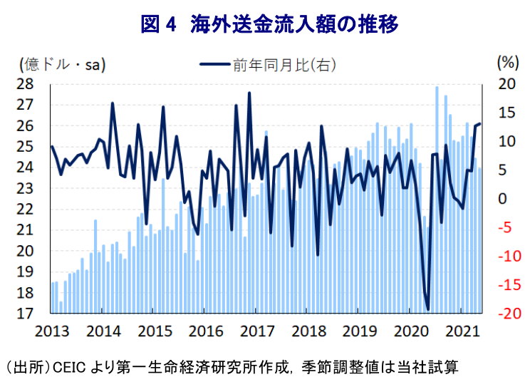 なお、上述のようにドゥテルテ政権の任期は1年を切る一方、現行憲法の下では現職のドゥテルテ氏が次期大統領選に出馬することは出来ない一方、ドゥテルテ氏の長女で現在南部のダバオ市長を務めるサラ(・ドゥテルテ)氏が大統領選に出馬するとともに、ドゥテルテ氏自身は別途行われる副大統領選に出馬して双方が勝利すればドゥテルテ大統領が次期政権においても影響力を残すことは可能である。ただし、その実現には新型コロナ禍を経て疲弊した同国経済を逸早く立て直すことで実績を上げることが不可欠になるとみられる。同国経済を巡っては成長のけん引役が家計消費をはじめとする内需であり、年明け以降における感染再拡大や行動制限の再強化の動きは景気の重石となることが懸念された。事実、4-6月の実質GDP成長率は前年同期比+11.8%と前期(同▲3.9%)から6四半期ぶりのプラス成長に転じたものの、これは昨年の新型コロナ禍を受けて景気が急減速した反動が大きく影響しており、前期比年率ベースの成長率は▲5.13%と前期(同+2.79%)から4四半期ぶりのマイナス成長に転じるなど景気は完全に『踊り場状態』にあると捉えることが出来る。景気の下支えを図るべく政府が公共投資の拡充に動いていることなどが影響して、公共投資の進捗が固定資本投資を大きく押し上げる動きがみられる一方、主要国を中心とする世界経済の回復にも拘らず行動制限の再強化を受けた生産活動の停滞を受けて財輸出に下押し圧力が掛かるなど、外需は景気の足を引っ張る動きに繋がっている。さらに、海外移民労働者からの送金も頭打ちの動きを強めるなか、昨年後半以降における国際原油価格の上昇などを理由にインフレ率は高止まりするなど家計部門の実質購買力に下押し圧力が掛かり、行動制限の再強化を受けた人の移動の低迷も相俟って家計消費は低迷するなど景気の重石となっている。産業別の生産動向を巡っても、世界経済の回復を追い風とする財輸出の底堅さを反映して製造業や鉱業部門の生産は拡大しているほか、農林漁業の生産も緩やかに拡大している一方、家計消費をはじめとする内需の弱さを反映してサービス業の生産はマイナスとなるなど景気の足を引っ張る様子がうかがえる。また、このところの感染再拡大を受けて人の移動に再び下押し圧力が掛かるなど家計消費の重石となる動きがみられることを勘案すれば、足下の景気も引き続き力強さを欠く展開となっているとみられるとともに、回復の糸口は見いだせない状況にあると判断出来る。