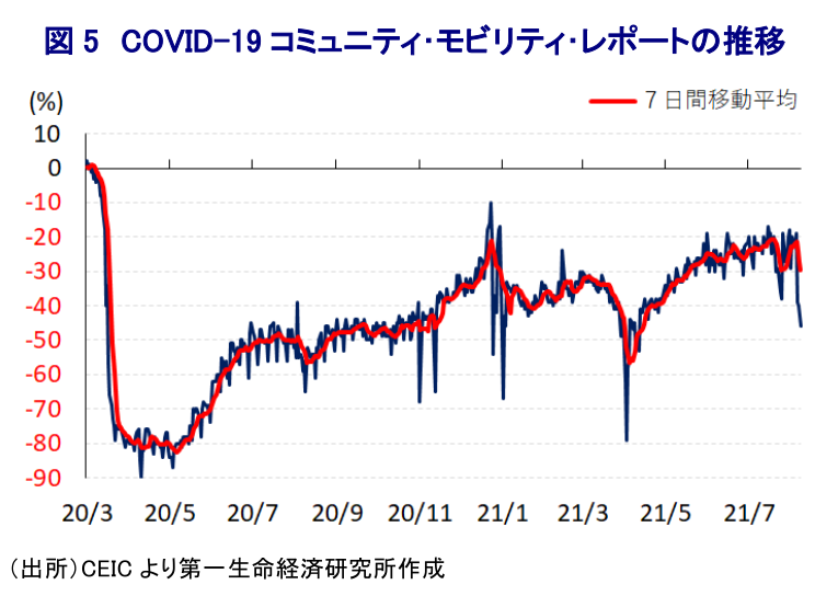 - 現憲法ではドゥテルテ氏は次期大統領選に出馬出来ないものの、娘が大統領、自身が副大統領に就任出来れば影響力を維持することが可能となる。他方、その実現には逸早い経済の立て直しが不可欠だが、4-6月の実質GDP成長率は前期比年率▲5.13%と4四半期ぶりのマイナス成長となるなど踊り場を迎えている。家計消費など内需の弱含みが景気の足を引っ張っている上、足下では感染再拡大を受けて人の移動に下押し圧力が掛かる動きもみられるなど、景気回復の糸口を見いだせない状況に直面していると判断出来る。