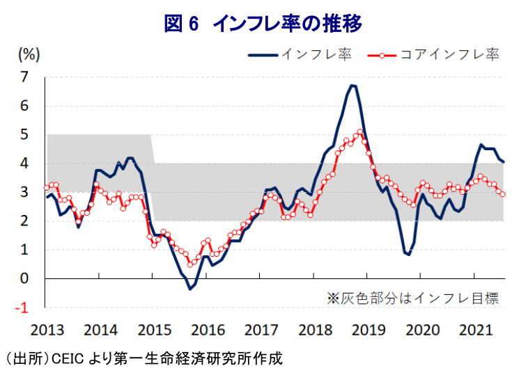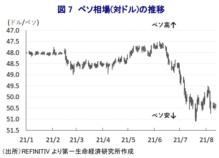 - 昨年後半以降の国際原油価格の上昇に加え、足下ではペソ安による輸入物価の押し上げを受けてインフレ率は中銀の定めるインフレ目標を上回る推移が続く。中銀は12日の定例会合で政策金利を6会合連続で過去最低水準に据え置き、先行きも景気下支えに向けて可能な限り現行の緩和姿勢を維持する考えを示した。他方、ペソ安が進めば金融引き締めを迫られるリスクもあり、今後の感染動向が重要になると言えよう。
