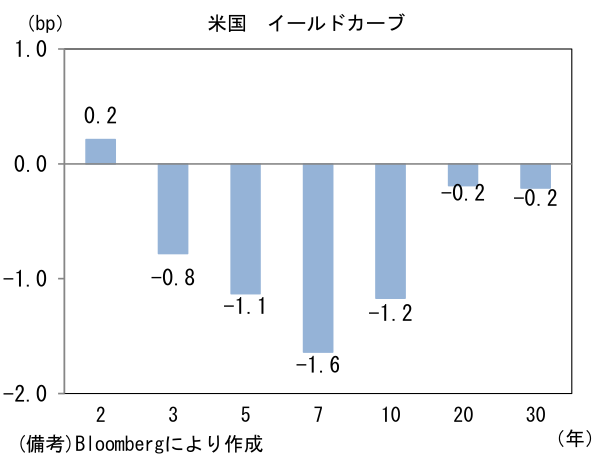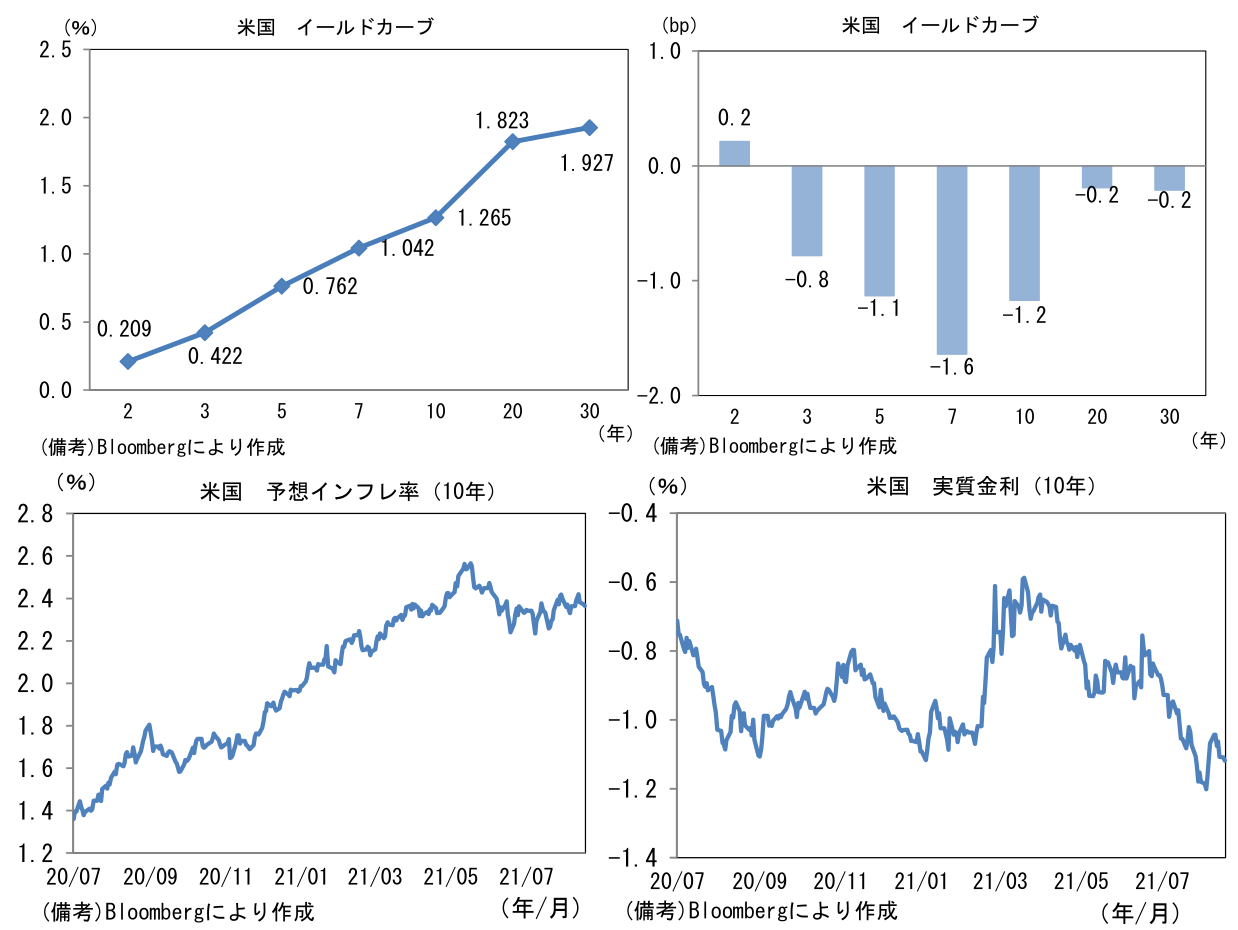 - 米金利カーブは中期ゾーンを中心に金利低下。債券市場の予想インフレ率(10年BEI)は2.373%(▲0.9bp)へと低下。実質金利は▲1.109%(▲0.2bp)へと低下。