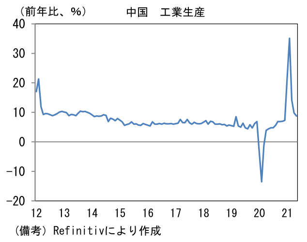 - 中国の7月鉱工業生産は前年比+6.4%へと6月の+8.3%から減速。市場予想(+7.9%)を下回った。当局公表の前月比は+0.3%に留まりパンデミック発生後で最も低い伸びであった。業種別では自動車が前年比▲8.3%と大幅な減産。半導体不足、自然災害(洪水)による供給制約が主因とみられるが、需要そのものが鈍化している可能性も否定できず、やや不安である。世界的なIT関連財の需要好調を背景に電気機械は+10.3%、コンピューター等通信機器は+13.0%と高い伸びを保ったものの、一方で一般機械は+7.6%へと1桁台の伸びへと減速した。設備投資意欲が減衰している可能性がある。