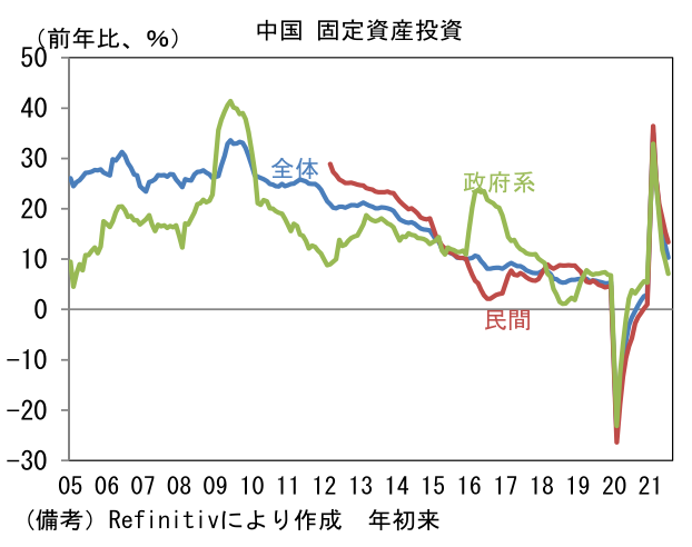 - 固定資産投資に目を向けると年初来前年比は+10.3%へと減速。前月比では+0.18%であった。民間投資は+13.4%と底堅さを維持する一方、政府部門(国営企業)が+7.1%と減速傾向にある。業種別では、鉱工業生産と同様に電気機械が前年比+21.3%、コンピューター等通信機器が+25.4%と高い伸びを保った反面、自動車は▲3.5%と弱さが続いた。不動産開発は+12.7%となお旺盛も、当局が規制を強めていることもあってか伸び率は減速傾向にある。