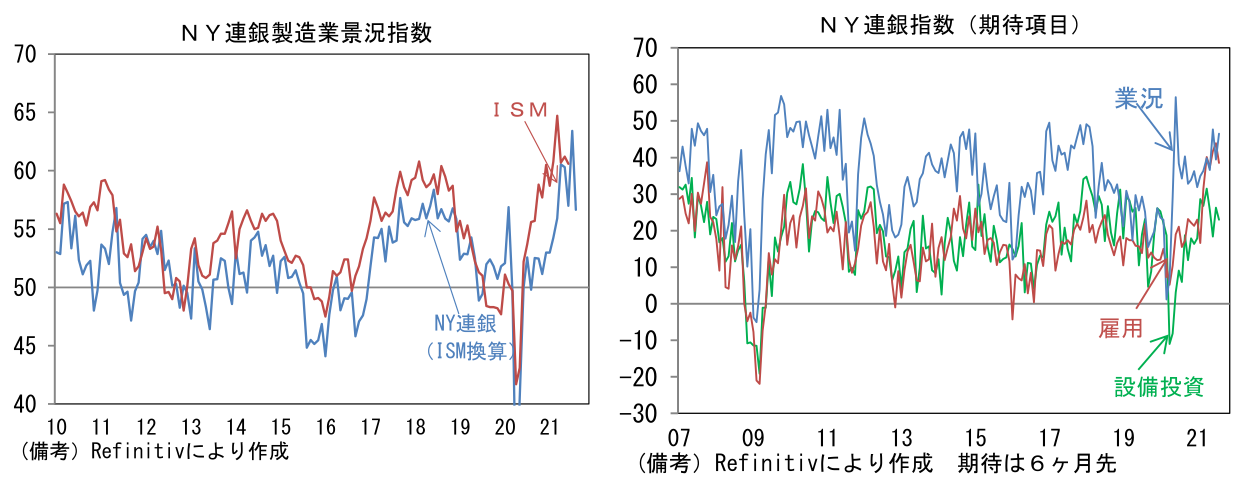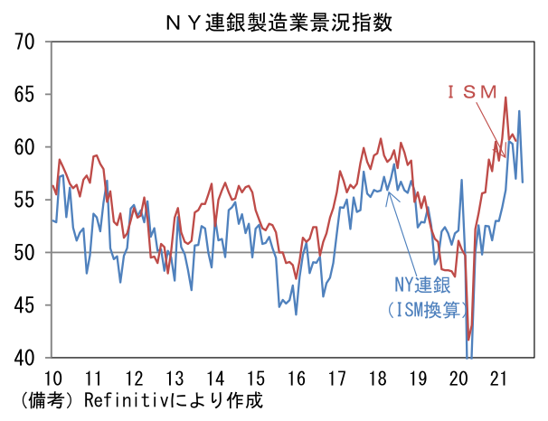 - 8月NY連銀製造業景況指数は+18.3と7月の+43.0から急低下。市場予想(+28.5)も下回った。7月の値が極端に高かった(それ以前の最高記録を4.0ptも上回る)反動によって大幅低下となったが、水準は十分に高く悲観論に傾けるには距離がある。ISM換算では56.7であった。内訳は出荷(+43.8→+4.4)、新規受注(+33.2→+14.8)、雇用(+20.6→+12.8)が何れも低下。サプライヤー納期(+20.2→+28.3)は押し上げに寄与。在庫(+16.2→+6.2)は下押しに寄与であった。その他では週平均労働時間(+14.0→+8.9)が低下した反面、受注残(+12.1→+15.0)は上昇。6ヶ月先の期待項目は業況(+39.5→+46.5)が改善、一方で雇用(+43.9→+38.5)と設備投資(+26.3→+23.0)は高水準から低下した。