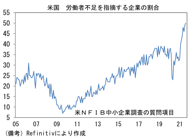- 8月NFIB中小企業楽観調査は100.1へと小幅改善。サブ項目では「雇用計画」が高水準から一段と上昇し、「労働者不足を指摘する企業の割合」も大幅に上昇。JOLT求人件数が既往最高で推移するなか、改めて企業の人手不足感が示された。今後、賃金上昇圧力が強まる可能性がある。