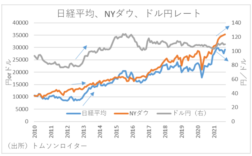 - 第二次安倍政権下で株価が大幅上昇した最大の要因は金融政策のレジームチェンジ。これによって極端な円高・株安が是正され、日本株が海外の株価と連動性を高めるようになった。