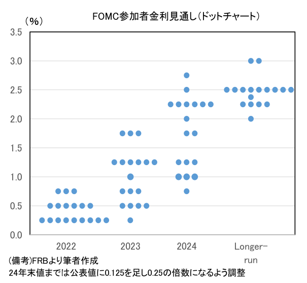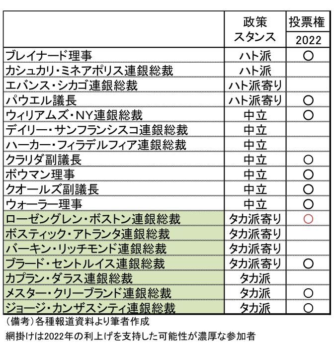 2022年の投票メンバーは2022年の利上げ開始を支持している9名のうち少なくとも4名が投票権を有するはずであった。ローゼングレン総裁の他では、筋金入りのタカ派として知られているジョージ・カンザスシティ連銀総裁とメスター・クリーブランド連銀総裁、そして2021年入り後にタカ派色を強めたブラード・セントルイス連銀総裁が加わる。もちろんローゼングレン総裁の後任次第ではあるが、少なくとも現時点では確実な「利上げ票」が1つ減った形になる。