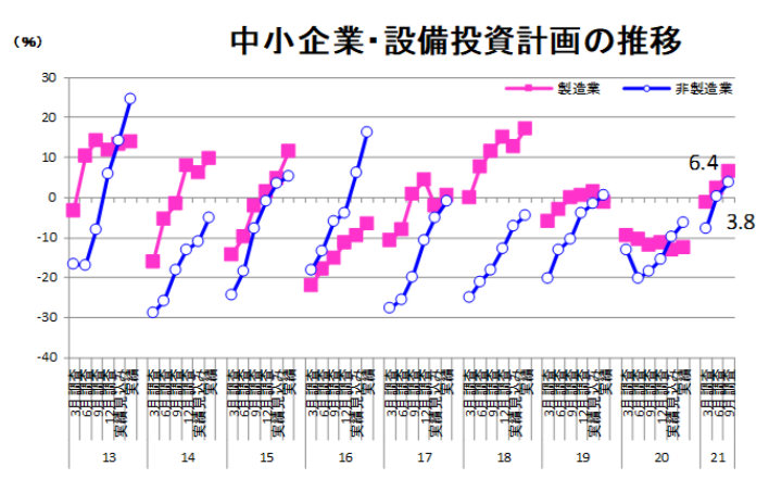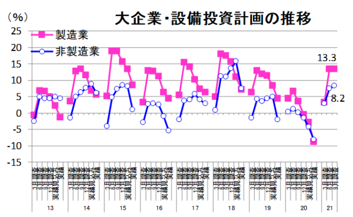 収益面では、大企業・製造業の経常利益計画は、2021年度前年比12.7%と、こちらも前回比+8.4%とより大きく上方修正された。大企業・非製造業の経常利益が前回比+2.6%ポイントと小幅だったのに比べると、大企業・製造業の収益の上方修正幅は大きい。この差が業況DIの上昇幅の違いに表れているとみられる。