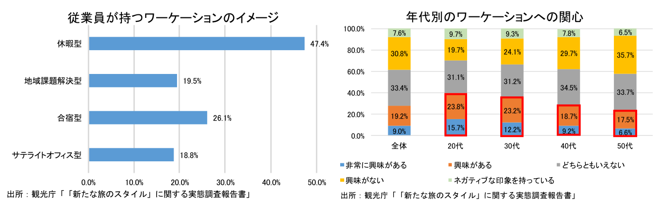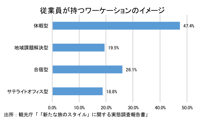 ワーケーションは、大きく休暇型と業務型とに分類される。休暇型とは、有給休暇を活用してリゾートや観光地等でテレワークを行うタイプを指し、Vacationの色合いが強いワーケーションと言うことができる。休暇型は企業が有給休暇の取得促進など、福利厚生を目的に行っている場合が多く、日本におけるワーケーション導入のきっかけとなった類型となっている。一方で、業務型は仕事をメインにするものであり、その前後に休暇を楽しむタイプで、Workの色合いが強いワーケーションと言える。業務型は更に、地域課題解決型、合宿型、サテライトオフィス型の3つに分類される。地域課題解決型は地域関係者との交流を通じて地域課題の解決策を共に考える形態、合宿型は通常の業務環境とは異なる所で会議や研修等を行う形態、サテライトオフィス型は会社が設置しているサテライトオフィスやシェアオフィス等を利用してテレワークを行う形態となっている。観光庁が公表した「「新たな旅のスタイル」に関する実態調査報告書」(以下、実態調査報告書)によると、ワーケーションとしてイメージする形態は企業・従業員共に休暇型が最も高い割合となっており、休暇型がワーケーションの代表格として認識されていることがうかがえる。