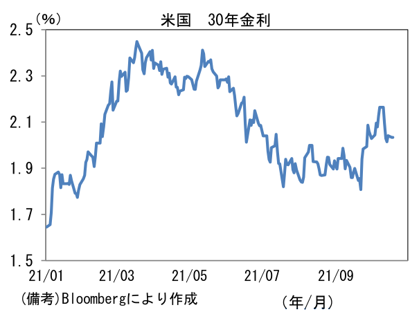 ①については世界的にワクチン接種が進展する下、コロナ感染状況の好転は欧米先進国からアジアを含むその他地域に広がりを伴ってきた。世界のコロナ新規死亡者数は明確に下向きのカーブを描き、経済活動再開も加速しつつある。今春から夏にかけて猛威を奮ったデルタ株の出現以降、感染力の強い新たな変異株は確認されておらず、投資家の警戒感は和らぎつつある(Our World in Dataにおいてデータ取得が可能な国において、大半の主要国はデルタ株のシェアが100%)。投資家は既存のワクチンと新たな治療薬が所期の効果を発揮し、感染収束シナリオに自信を深めるだろう。今後、国境を跨ぐ往来が本格的に再開され、サービス業の正常化が一段と進展すると共に、コロナ影響で稼働率低下を余儀なくされた工場の再稼働も期待される。半導体不足はなお残存するものの、大きく見ればサプライチェーン問題は解決に向かい、そうした下で物価上昇は落ち着き、スタグフレーションは回避されるだろう。また米国においては、これまで手厚い失業給付を受け取っていた人の復職が進むことで「逆フィリップスカーブ」の実現が予想される。