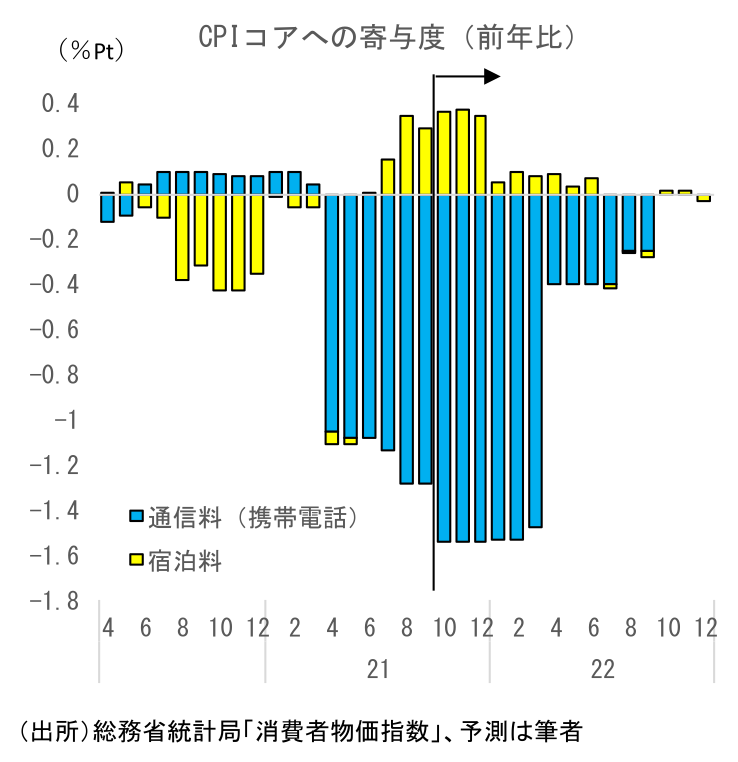 先行きのCPIを見る上では、エネルギー価格のほか、宿泊料と携帯電話通信料という攪乱要因にも注意する必要がある。宿泊料については、昨年12月までGoToトラベルが実施されていたことの裏が出ていることから、前年比で+0.3%Pt程度の押し上げ要因になっているが、22年1月には、GoToトラベル停止から1年が経過することで、前年比での押し上げ寄与が剥落する。また、携帯電話通信料については、21年4月に大幅値下げが実施されたことでコアCPIを大きく押し下げる状態が続いているが(その後も断続的に値下げ実施)、22年4月には、値下げから1年が経過することで、21年4月の値下げによる押し下げ分が剥落することになる。1%Ptを超えるマイナス寄与が消えるため、22年4月のCPIは跳ね上がることが確実である。