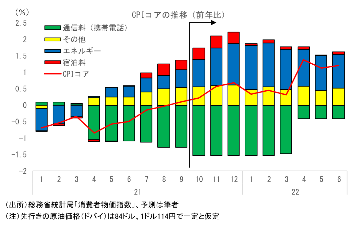 原油価格の一段の上昇継続、食品の値上げラッシュ、価格転嫁の進展などが重なれば、「22年4月にCPIコアが前年比+2%到達」となる可能性も否定できない。