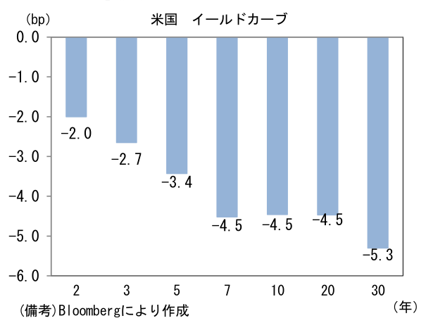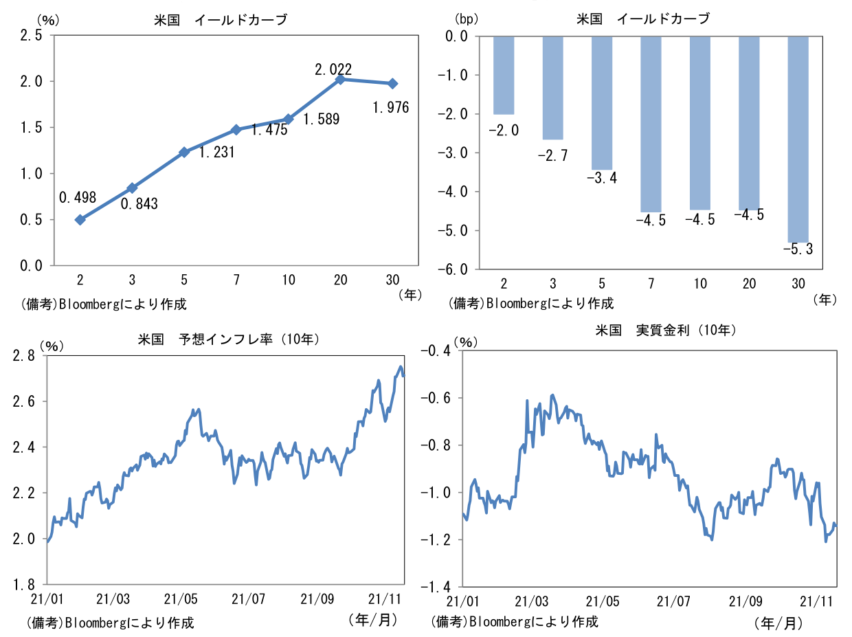 - 米金利カーブはブル・フラット化。債券市場の予想インフレ率(10年BEI)は2.710%(▲3.2bp)へと低下。実質金利は▲1.141%(▲1.1bp)へと低下。