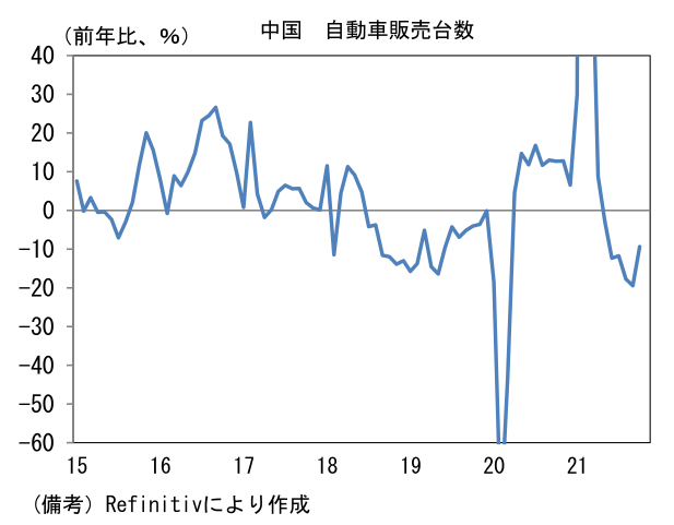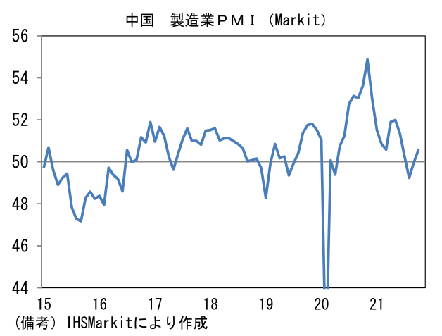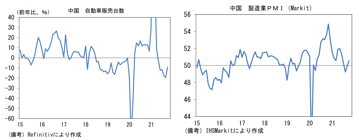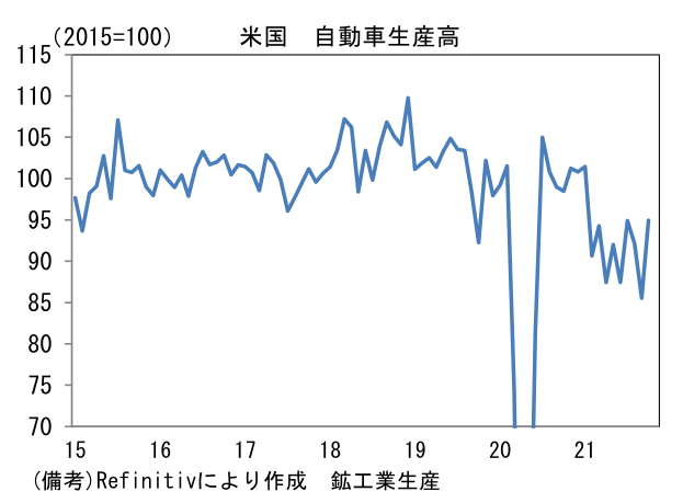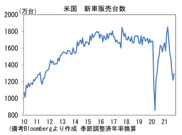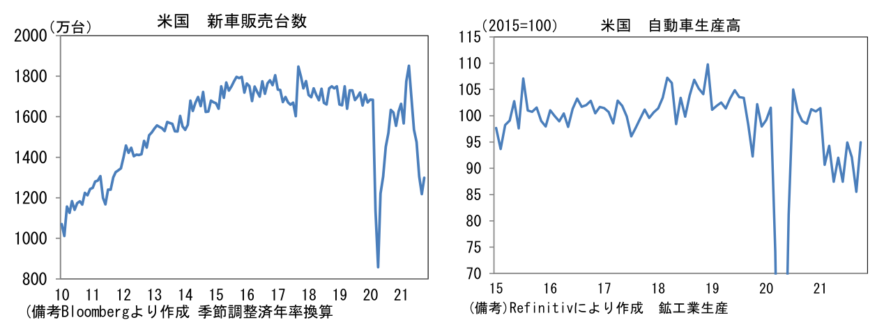 日本では経産省が公表する生産予測調査で前向きな動きが示されている。輸送機械の生産計画は+17.9%、11月は+35.0%と極めて強い。半導体不足はなお残存するものの、アジアからの部品供給が正常化に向かったことで、生産体制は最悪期を脱出した可能性が高い。部品工場が集積する東南アジア諸国(タイ、マレーシア、ベトナム)ではコロナ感染状況が安定する下、工場稼働率は上昇しており、上記3ヶ国の製造業PMIは10月に50の節目を回復した。そうした状況下、自動車最大手は12月の生産台数が過去最高を更新すると伝わっている。