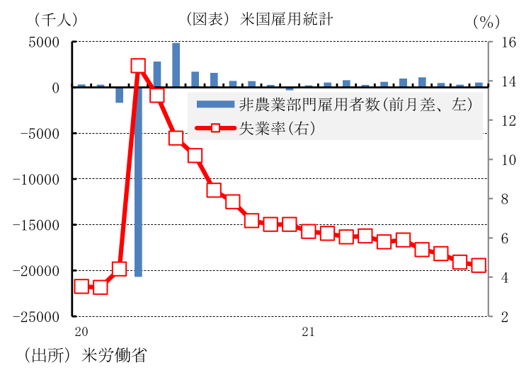 以上のような経済情勢のもと、FRBは22年6月に資産購入を終了するが、インフレの低下を受け政策金利の引き上げに辛抱強くなるとみられ、22年中の利上げを見送る公算が大きい。
