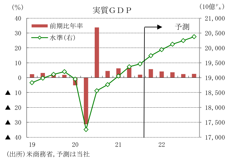 米国では、ワクチン未接種者、マスク不着用者を中心に感染が拡大している。しかし、ワクチン接種者は重症化し難いほか、行動規制への抵抗が強いためロックダウンが行われる可能性は低く、景気への悪影響は限定的なものにとどまろう。21年10-12月期には、雇用・給与所得の増加のほか、行動制限の緩和や入国制限の緩和等を背景に、個人消費の再加速が見込まれる。また、収益の拡大や景気の先行きに対する楽観的な見方を背景とした設備投資の拡大、低水準の在庫の復元によって、前期比年率+6%程度の高い経済成長が予想される。この結果21年の実質GDP成長率は前年比+5.6%(20年同▲3.4%)と高成長が見込まれる。22年は、雇用・所得環境の改善や資産残高の増加を受け個人消費が堅調さを維持するほか、国内への製造拠点回帰の動きやコスト削減のための効率化投資の拡大等によって設備投資が高い伸びを維持し、実質GDP成長率は前年比+3.9%成長が予想される。