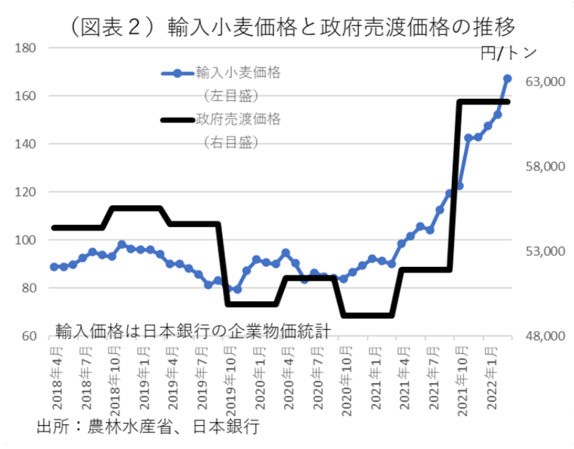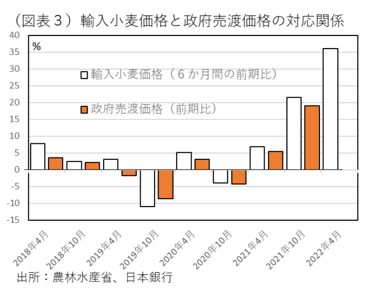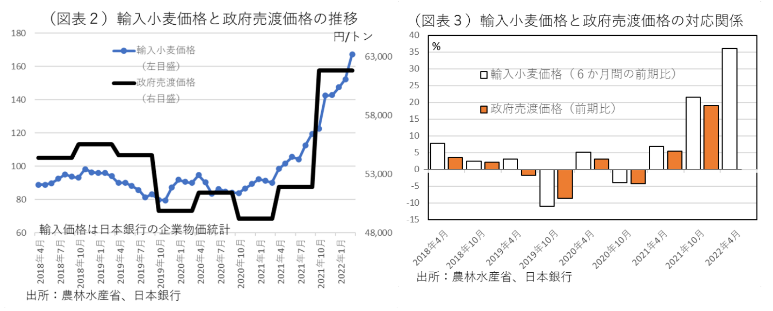 市況高騰の影響は、4月以降の政府の輸入小麦の売渡価格を大幅に上昇させると予想される。この政府売渡価格は、半年ごとに行われるが、前回2021年10月のときは2021年4月よりも+19.0%も値上げされた(図表1)。