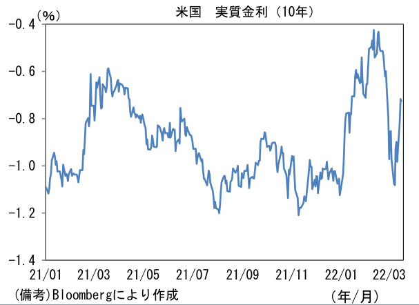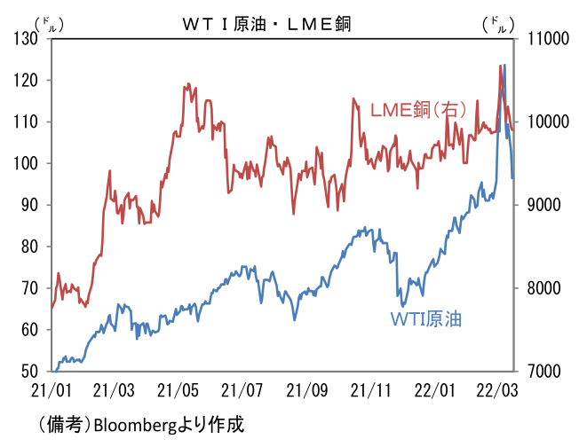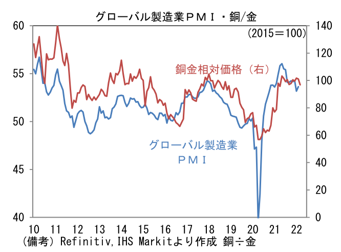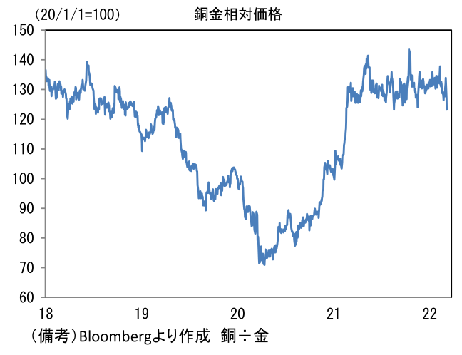 - ここ数日の原油価格急落はサプライズ。ウクライナ・ロシア情勢に大きな進展がないなか、WTI原油は節目の100ドルを割り込み、ロシアのウクライナ侵攻直前に接近しつつある。WTI原油は一時130ドル台を付ける場面があり、オイルショック再来の様相を呈していたことを踏まえると、少なくとも短期的にはエネルギー高に対する不安が後退したと言える。日本経済(日本株)にポジティブである。もっとも、ここまでの原油価格下落は景気の下振れリスクの兆候であると認識せざるを得ない。上述のNY連銀調査の弱さもその一つである。また景気の先行・一致指標として有用な「銅金相対価格」がここへ来て低下傾向にあるのも不気味。安全資産の「金」と景気の強さを示す「銅」の相対価格は、グローバル製造業PMIと長期的に連動性を有するなど、世界経済を映し出す鏡として重宝されている。ドクターコッパーとも言われる銅価格の下落によって相対価格が下向きのカーブを描いていることは認識しておきたい。中国の鉱工業生産が前年比+7.5%に持ち直すなど生産活動が持ち直している兆候も認められているが、世界全体でみれば雲行きが怪しくなっている可能性がある。