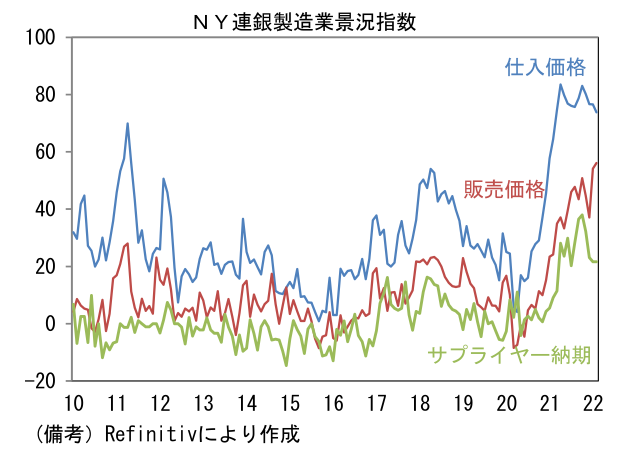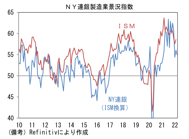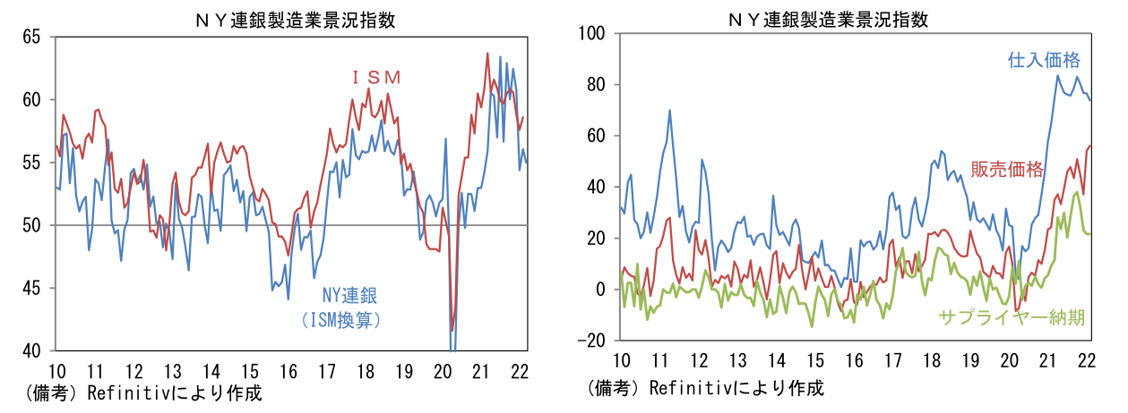 - 3月NY連銀製造業景況指数は▲11.8と2020年5月以来の低水準を記録。ISM換算では55.0へと低下した。内訳は生産(+2.9→▲7.4)と新規受注(+1.4→▲11.2)が共にマイナス圏に沈んだほか、雇用(+23.1→+14.5)も低下。在庫(+11.7→+21.5)の積み増しは進んだものの、サプライヤー納期(+21.6→+32.7)は長期化。供給制約がなお強いことを示唆。仕入価格は小幅低下、販売価格は小幅に上昇した。その他では週平均労働時間(+10.9→+3.5)と受注残(+14.4→+13.1)が低下。他方、6ヶ月先の期待項目は業況(+28.2→+36.6)、雇用(+25.5→27.0)、設備投資(+37.8→+35.5)が改善ないしは良好な水準を維持。期待項目が崩れていない点は安心だが、足もとで製造業の業況が急速に悪化している可能性が示唆された。今後発表されるフィラデルフィア連銀調査、ISM製造業の結果次第では市場関係者の景気認識が下を向く可能性がある。