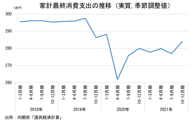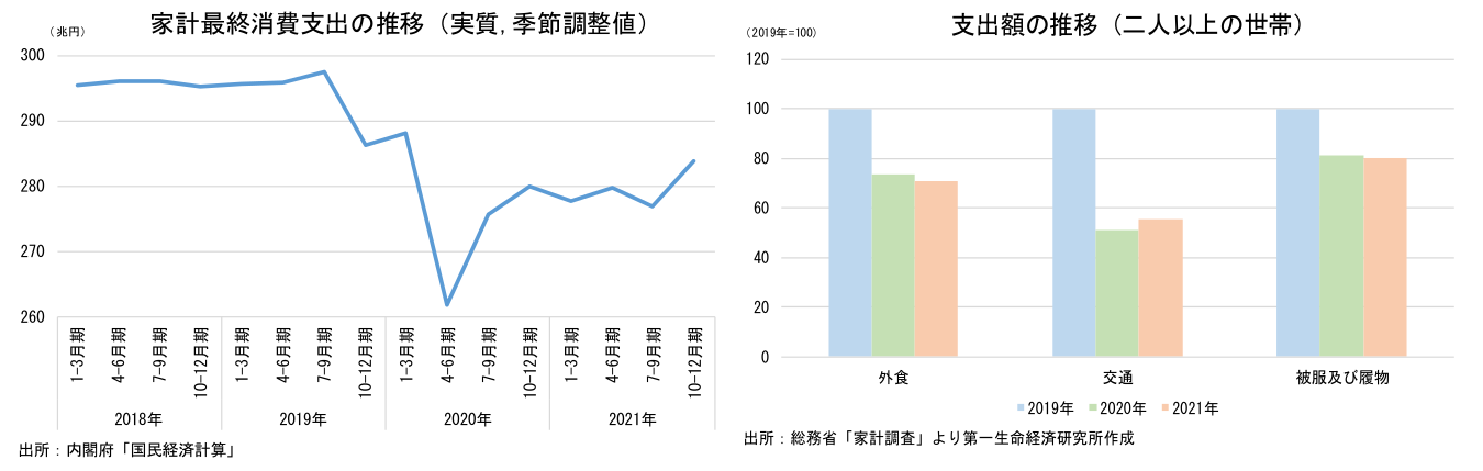 新型コロナウイルスの感染拡大を受けて、個人消費は大きく減少している。民間最終消費支出を見ると、感染状況が改善した2021年10-12月期に回復の動きがやや強まったものの、依然としてコロナ前の水準からは距離があり、消費の弱さが示されている。外出機会の減少や緊急事態宣言・まん延防止等重点措置などの経済活動への制約によって、飲食サービス業をはじめとした接触型サービスや鉄道・航空、衣料品など、幅広い分野で消費の減少が確認されている。
