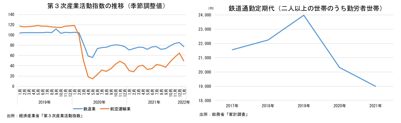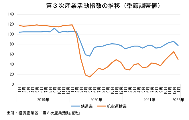 また、コロナ禍では、移動の制限や自粛が求められる中で交通費への支出も減少し、鉄道業・空輸業共に大きな打撃を受けている。供給サイドから各業種の活動を捉えた第三次産業活動指数を見ると、鉄道業・航空運輸業共にコロナ以降大きく減少していることが示されている。2020年の1回目の緊急事態宣言の発令時を底に振れを伴いながらも回復しているが、新型コロナウイルスが確認されてから二年が経過した現在でもコロナ前の水準には遠く及んでいない。感染状況が改善していることや3月21日をもってまん延防止等重点措置が解除されたことによって、今後は回復が見込まれるが、コロナ前までの回復は困難であると見ている。