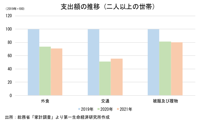 コロナ前への回帰が困難な業種は飲食サービス業や鉄道業、航空運輸業だけではない。テレワークをはじめとした生活スタイルの変化は、消費に不可逆的な影響を与えることになるだろう。本稿では交通や飲食といったサービス消費に焦点を当てているが、財消費に関しても、例えば背広服などへの支出は、出社を前提としたライフスタイルが変化したことで、コロナ前に戻ることは困難であると見ている。コロナ禍から脱却していく中で、経済活動が正常化に向かい、個人消費は回復していくことが見込まれるが、それは必ずしもコロナ前への回帰を意味するものではない点には注意を払う必要があるだろう。