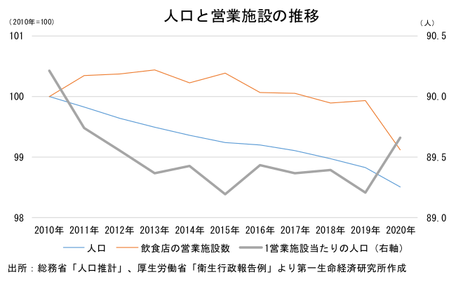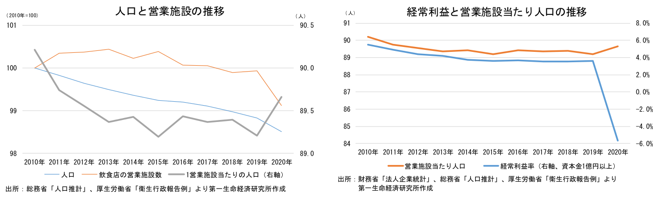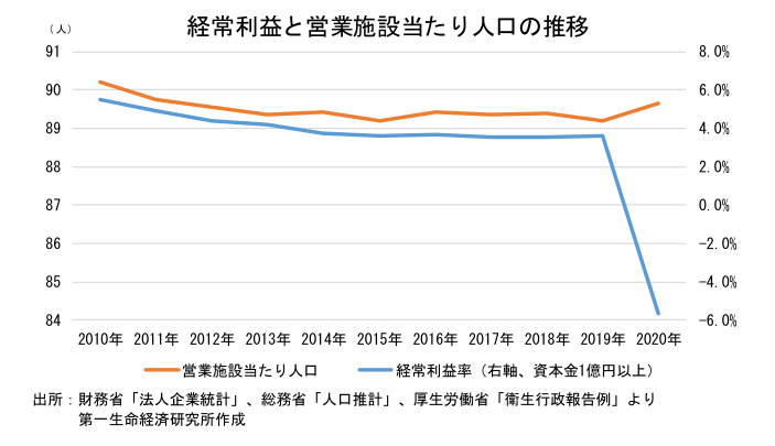 コロナ禍で大きく減少している支出項目として、外食への支出が挙げられる。感染を恐れての外出手控えや感染対策としての席数削減などの影響は、新型コロナウイルス発生から2年余りが経過した現在においても外食需要を強く押し下げている。厳しい経営環境の中で廃業に追い込まれた事業者も少なくなく、飲食店の営業施設数は大きく減少している。人口減少が本格化する2010年以降、人口減少ペースと比較して飲食店の営業施設数の減少ペースは緩やかであったため、1営業施設当たりの人口は減少傾向での推移が続いていた。競争環境が厳しくなる中で、飲食サービス業の経常利益率についてもじりじりと低下が続いていたが、2020年に新型コロナウイルスの影響が顕在化すると、営業施設数は減少し、それに伴い1営業施設当たり人口が増加(競争条件が改善)した。2021年の営業施設数のデータは現時点で取得できないが恐らく更に営業施設数は減少することが見込まれる。アフターコロナでは、協力金や雇用調整助成金の支給が終了する中で、営業施設の増加ペースは抑制的になることが想定される。新型コロナウイルスの感染拡大によって飲食サービス業は厳しい経営環境に追い込まれたが、少なくとも残存したプレイヤー間での過当競争は緩和されることになるだろう。