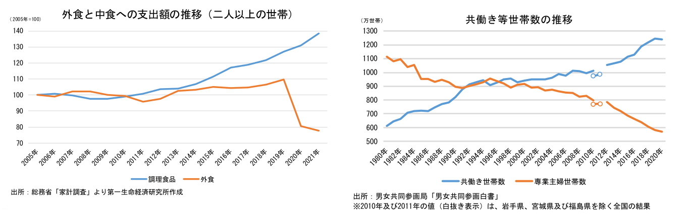 更に言うと、中食需要の増加はコロナ後に生じた特別な現象ではない。家計調査によると、2010年以降、12年連続で中食への支出額は増加しており2 、新型コロナウイルスが発生する10年以上前から、既に増加が続いていたことが示されている。共働き世帯の増加に伴う時短ニーズや中食の品質の向上、軽減税率適用に伴うコスト優位性などが影響している可能性がある。実際、共働き世帯が大きく増加し始めた2010年以降、調理食品の消費額も増加幅を拡大している。また、生活様式の見直しも飲食サービス業の回復の障壁となるだろう。アフターコロナの社会においてもテレワークは残り続けると見られ、オフィス近辺での外食ニーズは完全には元に戻らないだろう。忘年会や歓送迎会といった大規模な飲食ニーズも完全な形での復活は難しいと考えられる。