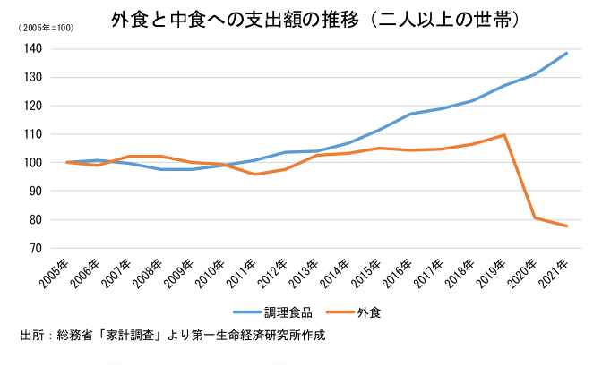しかし、アフターコロナでもコロナ前までの飲食サービス業の回復は困難であると見ている。まず理由として挙げられるのが、中食1の台頭だ。コロナ禍で外食需要が急激に減少する中で、中食需要が大きく拡大している。外食が手控えられる中で、代替需要を取り込み、中食需要が大きく拡大する結果となっている。外食サービス業のプレイヤー数が減少したとしても、中食の存在感が増すことで、広い意味での競争は激化しているのである。
