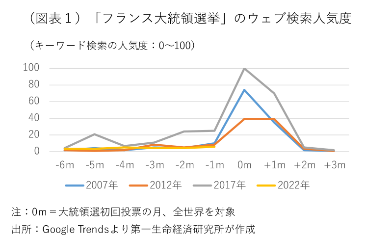 4月10日のフランス大統領選挙の初回投票まで10日余りとなったが、ウクライナ情勢の緊迫化やマクロン大統領の再選が濃厚と見られていることもあり、金融市場やメディアの関心は余り高まっていない。「フランス大統領選挙」のウェブでの相対検索数も過去の大統領選挙時と比べて伸び悩んでいる(図表1)。最近の世論調査では、マクロン大統領が安定的なリードを保ち、それを極右政党「国民連合」のルペン党首が追う展開が続いている(図表2)。ルペン候補とともに熾烈な二番手争いを行っていた新たな極右候補で新党「再征服」を旗揚げしたゼムール氏、ドゴール派の伝統政党「共和党」のぺクレス元予算相(現イル=ド=フランス地域圏首長)が失速し、代わりに極左政党「不服従のフランス」のメランション候補が猛烈に追い上げている。移民によるフランスのアイデンティティ喪失を重要争点とするゼムール候補は、過去のプーチン賞賛発言が非難され、支持を落としている。極右2候補に対抗するために政策の右傾化が目立ったペクレス候補は、党内の中道派の支持固めに失敗し、苦戦が続いている。