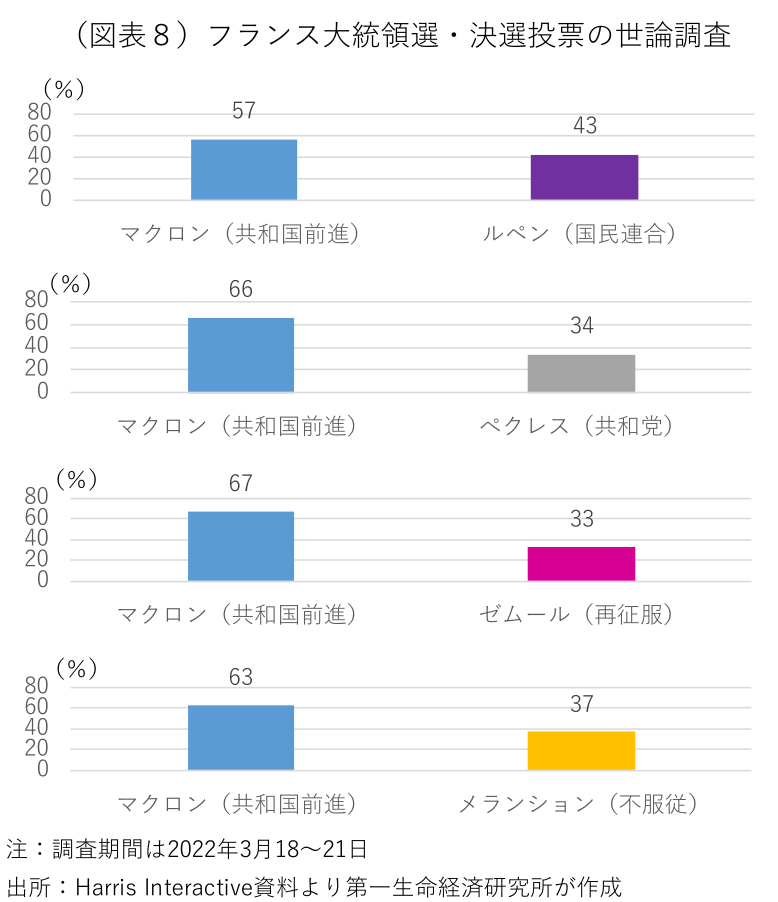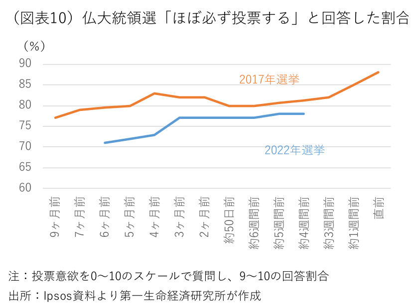 フランスの大統領選挙は歴史的に投票率が高いが、今回の大統領選挙では有権者の投票意欲が余り高くない(図表10)。決選投票が行われる4月24日は、学校の春休みと重なるうえ(フランスの学校祝日は地域毎で異なるが、何れの地域も同日が春休みに含まれる)、フランスでは郵送・オンライン投票や期日前投票が認められていない。初回投票でマクロン再選が濃厚との安心ムードが広がり、前回大統領選のように極右大統領誕生を阻止するために投票所に向かう有権者が少なくなれば、世論調査が示唆する以上にルペン候補が善戦する可能性もある。初回投票でのマクロン大統領の圧勝にこそ注意が必要となりそうだ。