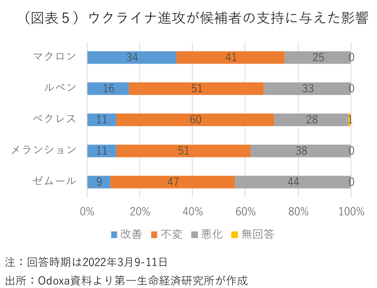 燃料税引き上げに反対した「黄色いベスト運動」に象徴されるように、法人税率引き下げや労働市場改革など、競争力強化を重視するマクロン大統領の政策には、大企業や金持ち優遇との批判もつきまとう。だが、2017年の大統領就任以来、コロナ禍で一時中断された時期を除けば、フランスは過去に比べて高い経済成長を実現し、失業率は大幅に低下した(図表3)。経済回復と雇用創出の実績を訴えて再選する当初の目論見はコロナ危機で崩れたが、雇用維持策や中小企業支援策が奏功し、フランスは欧州の他の主要国に先んじてコロナ危機前の実質GDPの水準を回復している(図表4)。ウクライナ進攻での指導力発揮と「旗の下への結集効果」も、マクロン大統領の支持拡大につながっている(図表5)。かつて二大政党の一角を占めた社会党の党勢凋落が続き、左派政党が候補者の一本化に失敗し、極右2候補と共和党候補の間で右派票が割れたことで、マクロン大統領は労せずに中道票を集めることに成功した。